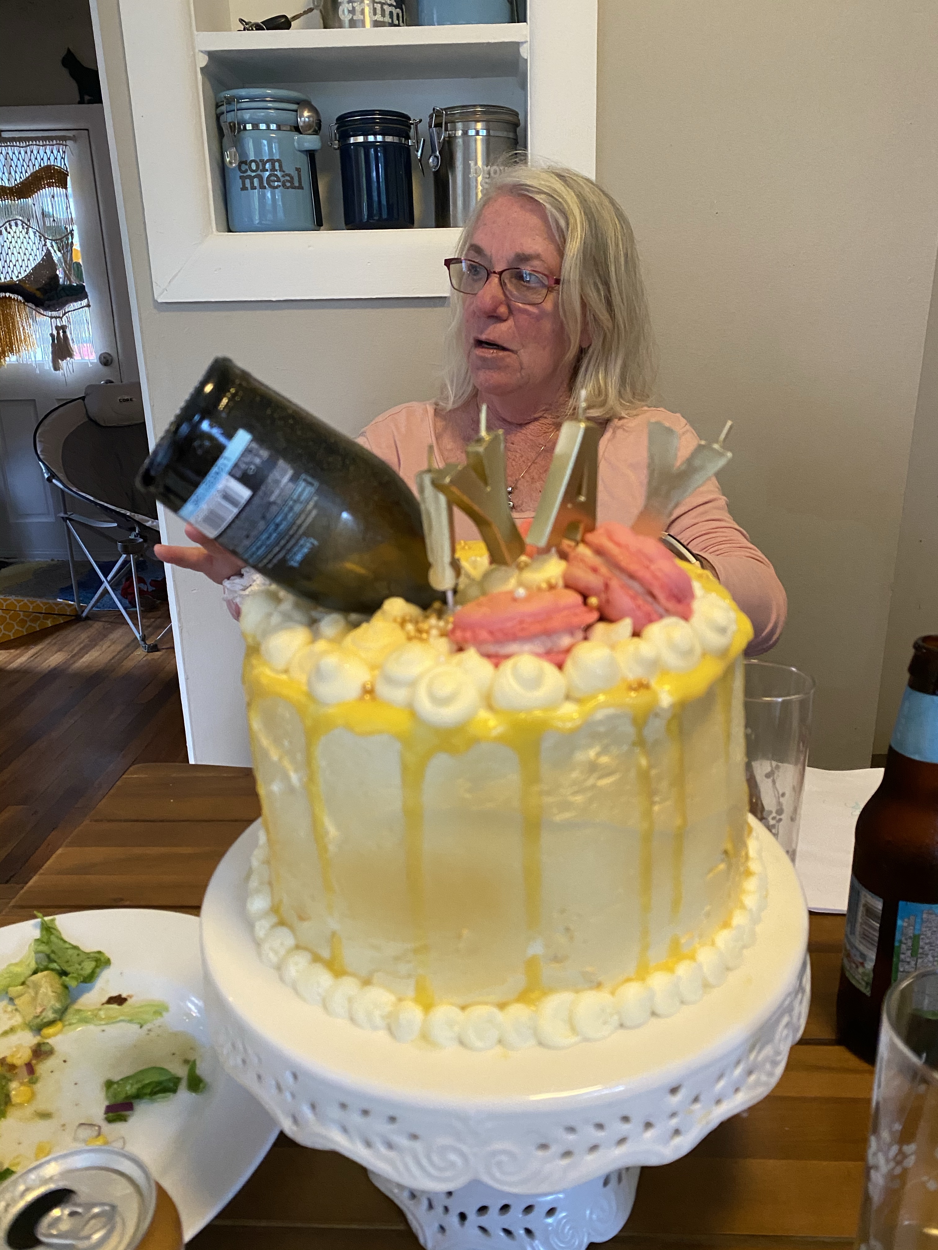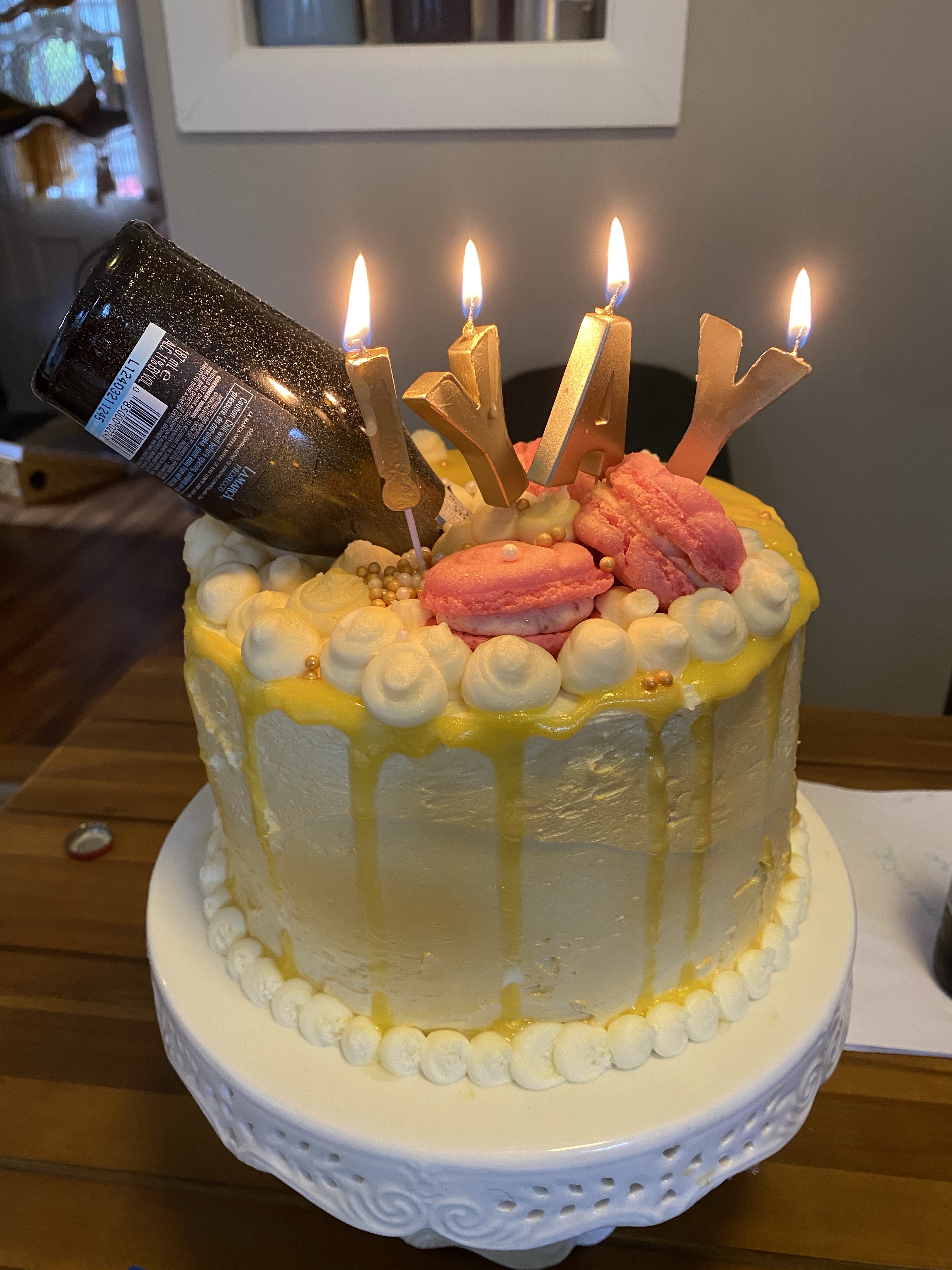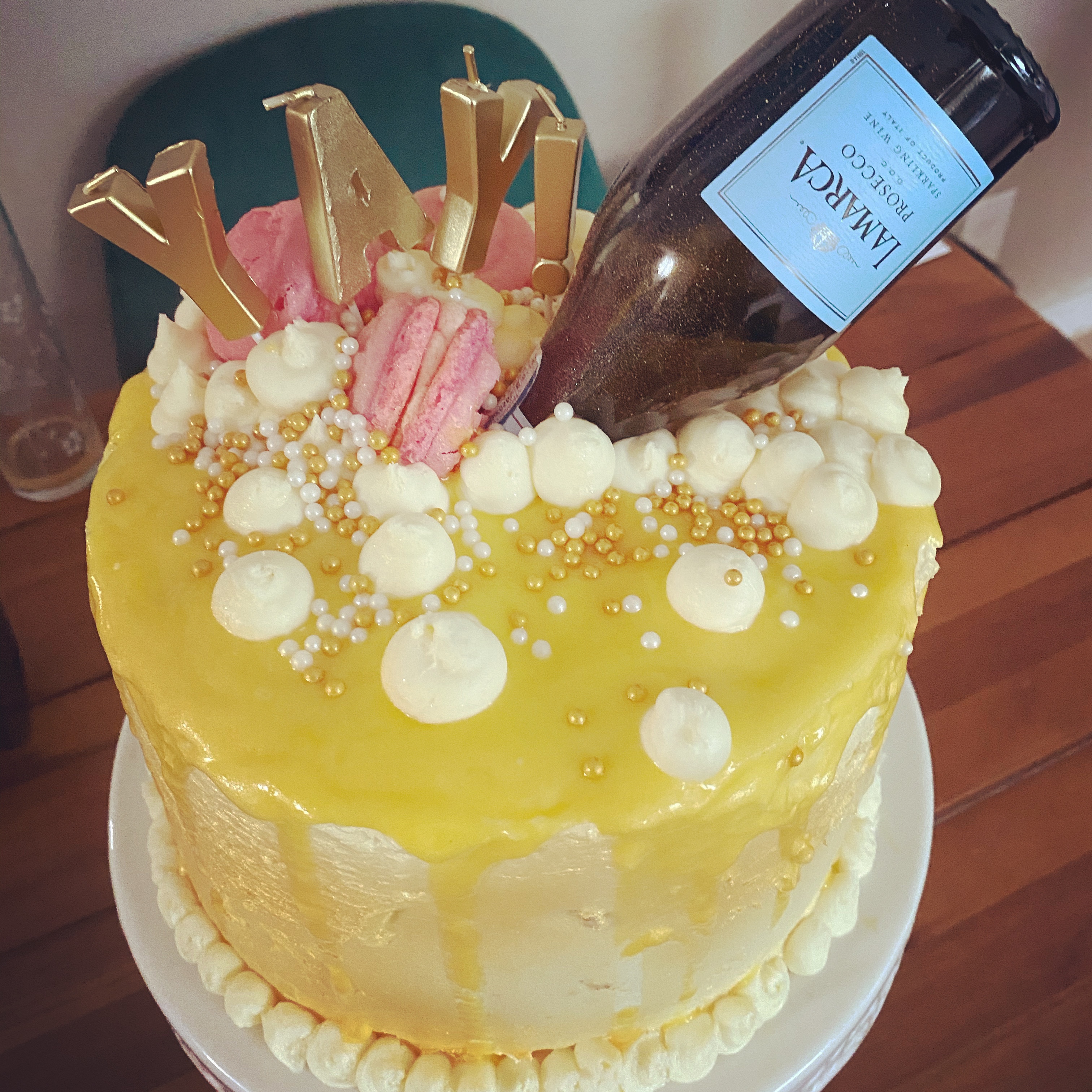 I liked the idea of the champagne appearing to spill on the cake which means drip cake! Drip cake is generally always made with chocolate or decorating chocolate but I didn’t want to add chocolate to this cake. So I just tried it with the lemon curd and hoped it stayed thick enough. Not the prettiest drip but I felt like it was worth it to preserve the right flavor combinations. I used a round tip to pipe “bubble” on the top of the cake and around the edge plus some large round sprinkles. Then added some gold food glitter and spray.