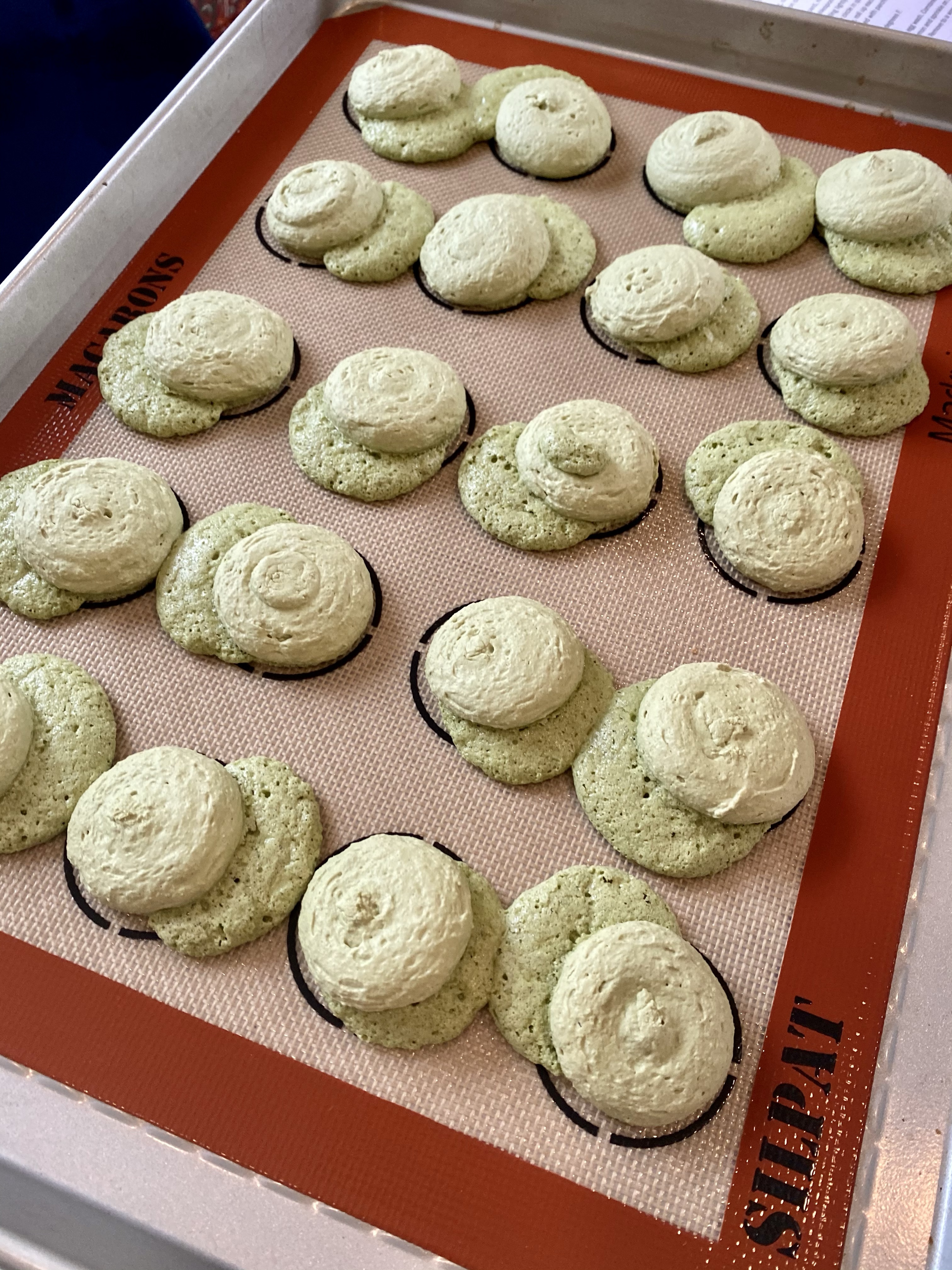 I cleaned up around them to make them more like the usual shape before adding the filling but you can see they leaked out all the inside and are just hollow. After some internet research, it seems I very likely over whipped them. I knew I went too long but didn’t think there was any harm. Oops! The reason I did was because I’d used larger grains of granulated sugar and they weren’t dissolving which also contributed to this kind of lumpy texture. So a few lessons learned there but they are still pretty yummy and just so interesting with the green tea flavor.